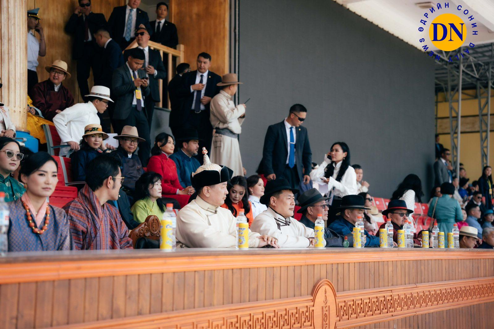 Монгол Улсын Ерөнхийлөгч Ухнаагийн Хүрэлсүх, УИХ-ын дарга Дашзэгвийн Амарбаясгалан, Ерөнхий сайд Лувсаннамсрайн Оюун-Эрдэнэ нар нээлтийн ажиллагааг үзэж, сонирхож, наадамчин олонд баяр наадмын мэнд дэвшүүллээ.