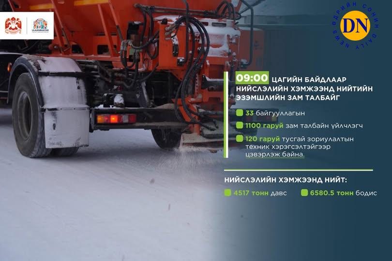 2025 оны нэгдүгээр сарын 14-ний өдрийн 09:00 цагийн байдлаар нийслэлийн хэмжээнд нийтийн эзэмшлийн зам талбайг нийт 33 байгууллагын 1100 гаруй зам талбайн үйлчлэгч, 120 гаруй тусгай зориулалтын техник хэрэгсэлтэйгээр цэвэрлэж байна.