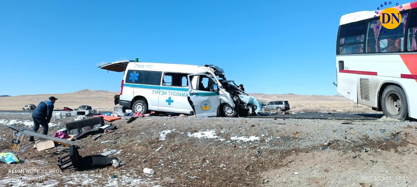 Ослын улмаас Toyota Hiace маркийн түргэний автомашинд зорчиж явсан 5 хүн, жолоочийн хамт буюу нийт 6 хүн нас барж, 2 хүүхэд гэмтжээ.