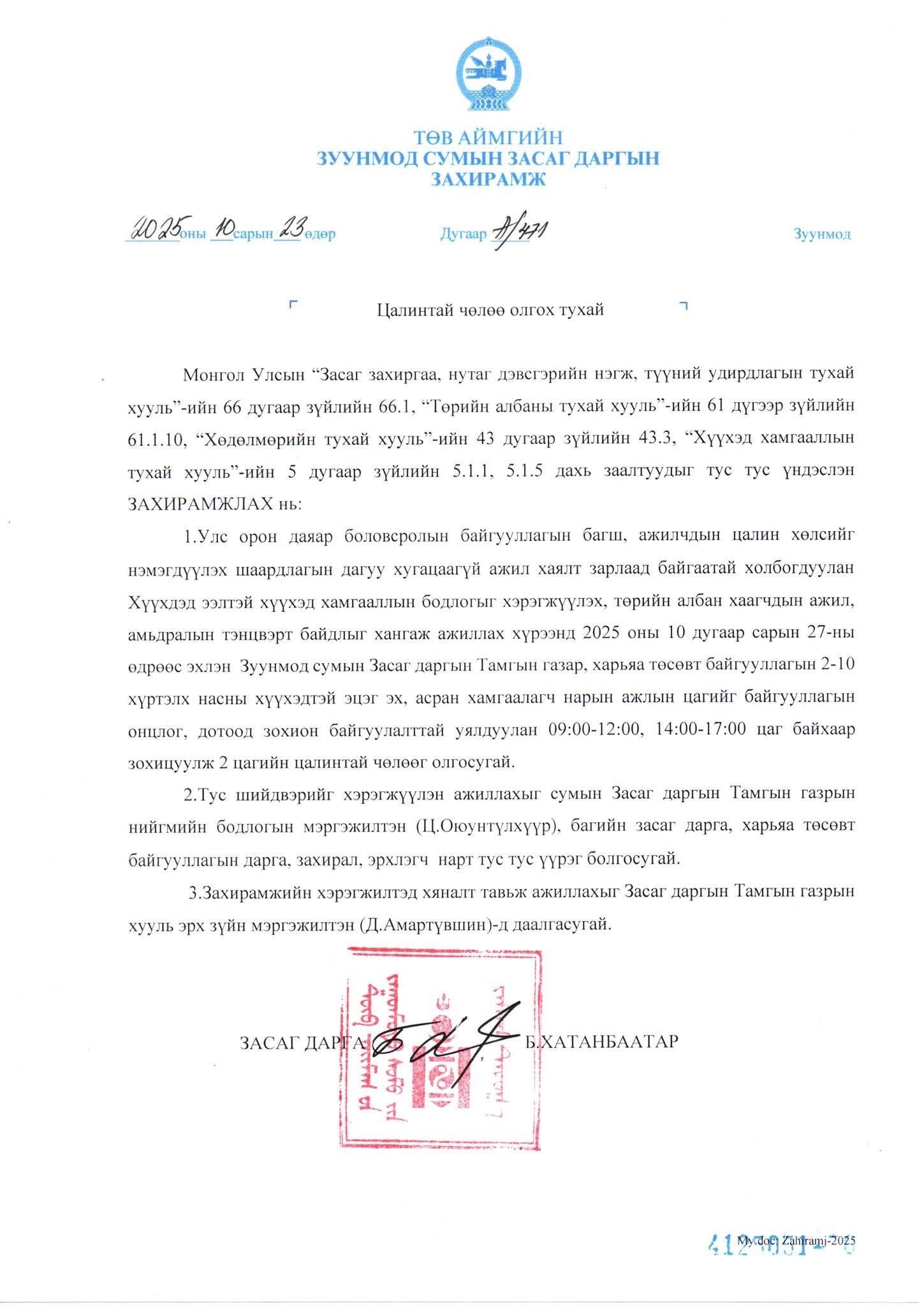 Төв аймгийн Зуунмод сумын Засаг дарга Б.Хатанбаатар ирэх даваа гарагаас эхлэн 2-10 насны хүүхэдтэй эцэг эхчүүдэд цалинтай чөлөө олгох тухай захирамж гаргажээ.