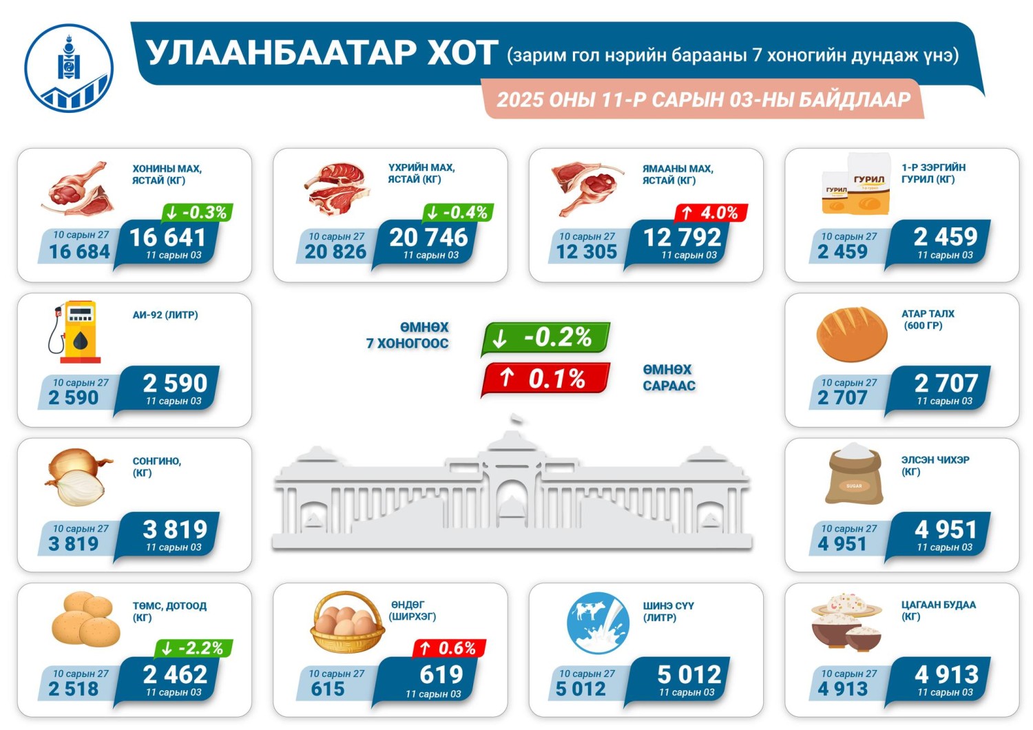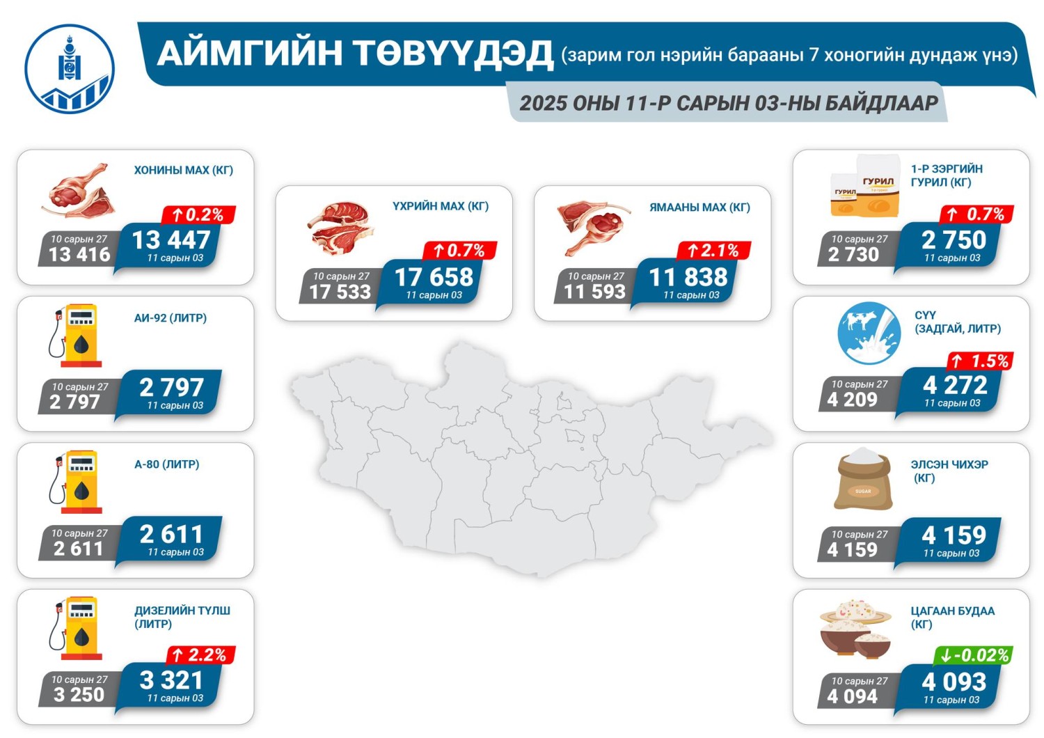 Үндэсний статистикийн хорооноос 2025 оны 11 дүгээр сарын 03-ны байдлаар Улаанбаатар хот болон аймгуудад гол нэрийн барааны дундаж үнэ ямар байгааг хүргэж байна.