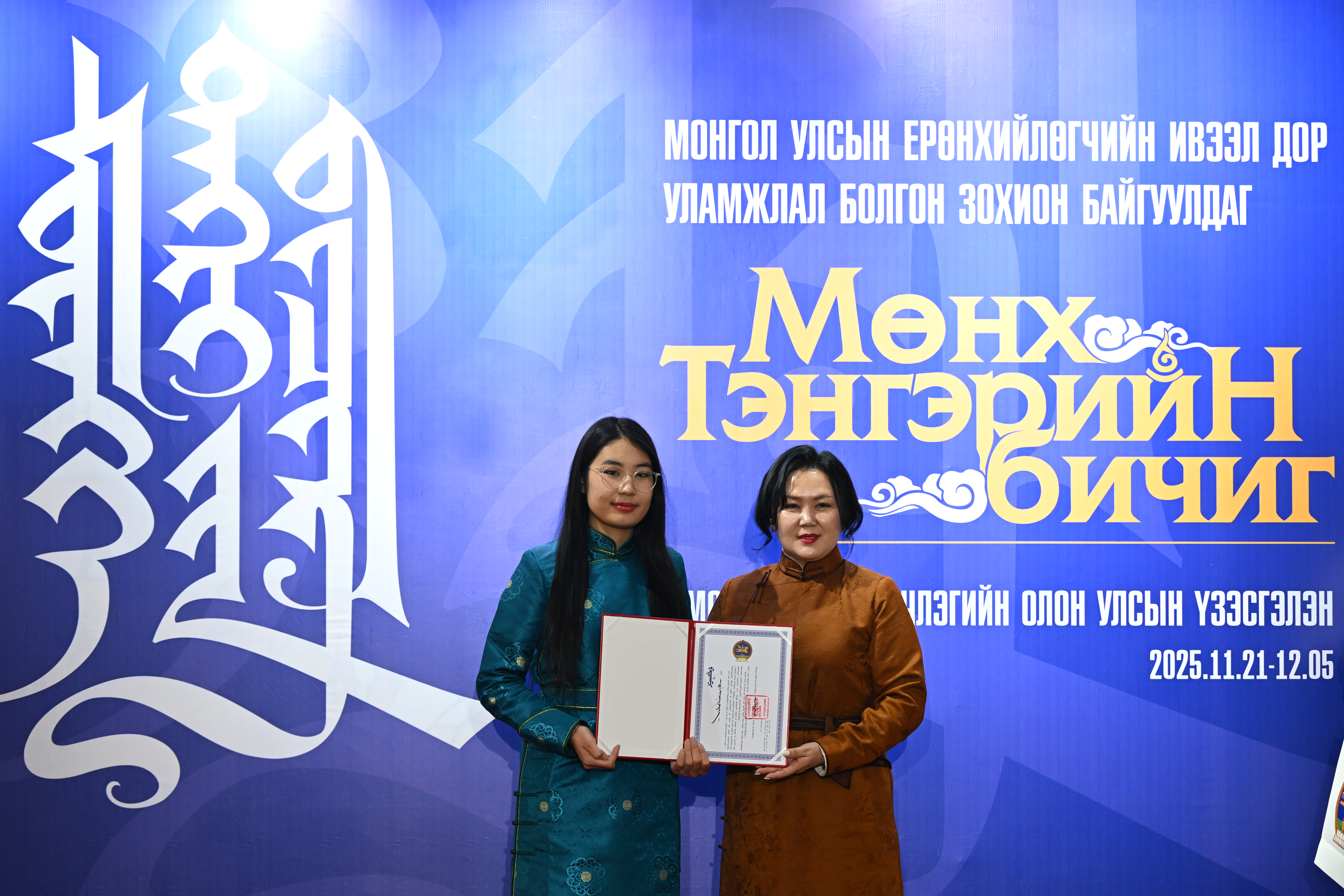 Эзэн Богд Чингис хааны мэндэлсэн өдөр, “Монгол бахархлын өдөр”-ийг тохиолдуулан Ерөнхийлөгчийн ивээл дор зохион байгуулдаг “Мөнх тэнгэрийн бичиг-2025” монгол уран бичлэгийн олон улсын үзэсгэлэнгийн нээлт Монголын Хүүхдийн ордонд боллоо.