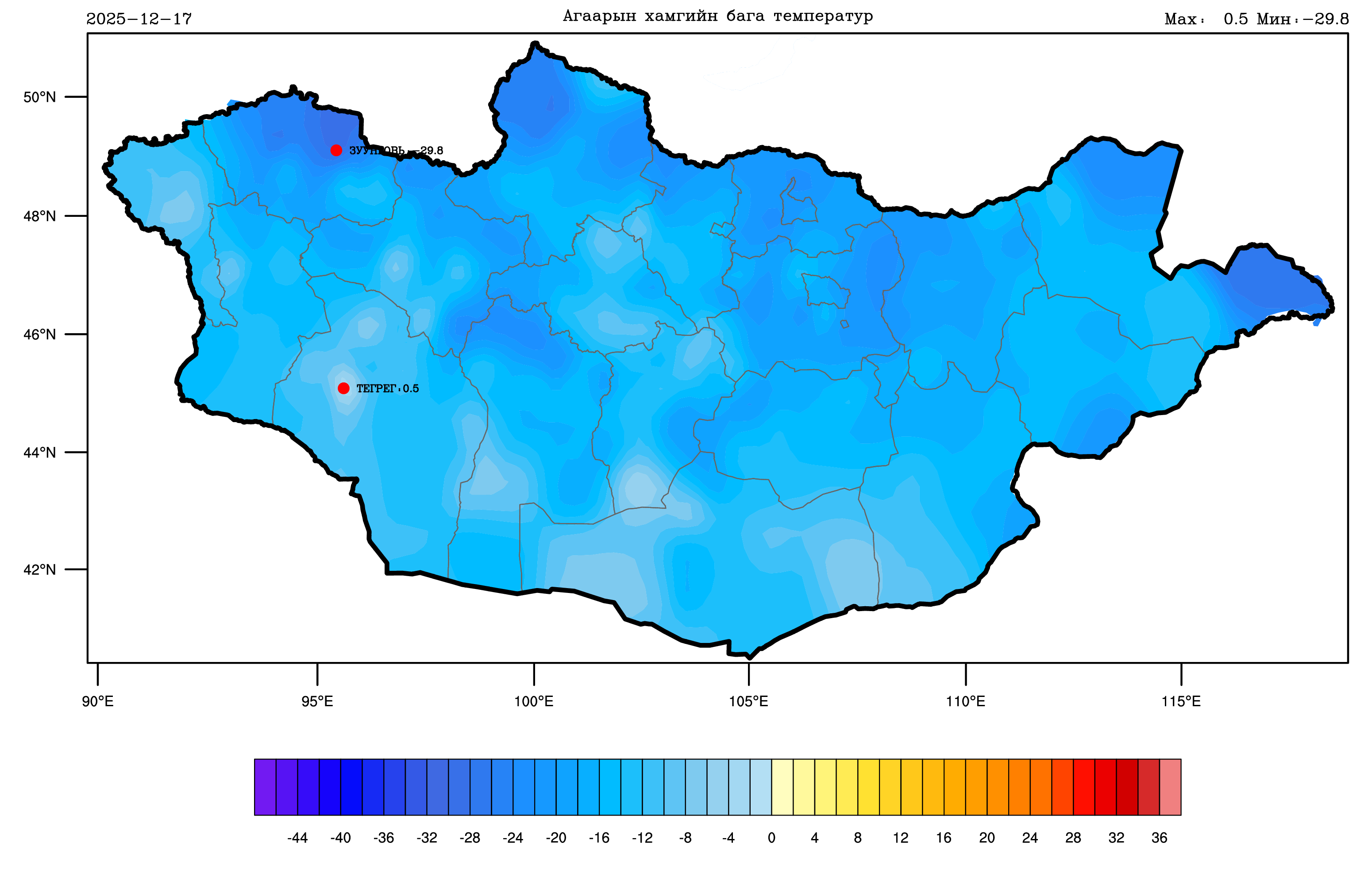 Агаарын хамгийн бага температур: Өнгөрсөн шөнө Увс нуур болон Дархадын хотгор, Завхан, Заг-Байдраг голын эх, Халх голын хөндийгөөр -25…-30 градус, Хөвсгөл, Хэнтийн уулархаг нутаг, Идэр, Тэс, Эг, Үүр, Орхон, Сэлэнгэ, Хараа, Ерөө, Туул, Тэрэлж, Хэрлэн голын хөндий, Дарьгангын тал нутгаар -19…-24 градус, Алтайн уулархаг нутаг, Их нууруудын хотгор, говийн бүс нутгийн өмнөд хэсэг, цас багатай энгэр ээвэр газраар -7…-12 градус, Алтайн өвөр говиор 0…-6 градус, бусад нутгаар -13…-18 градус хүйтэн хоносон байна.