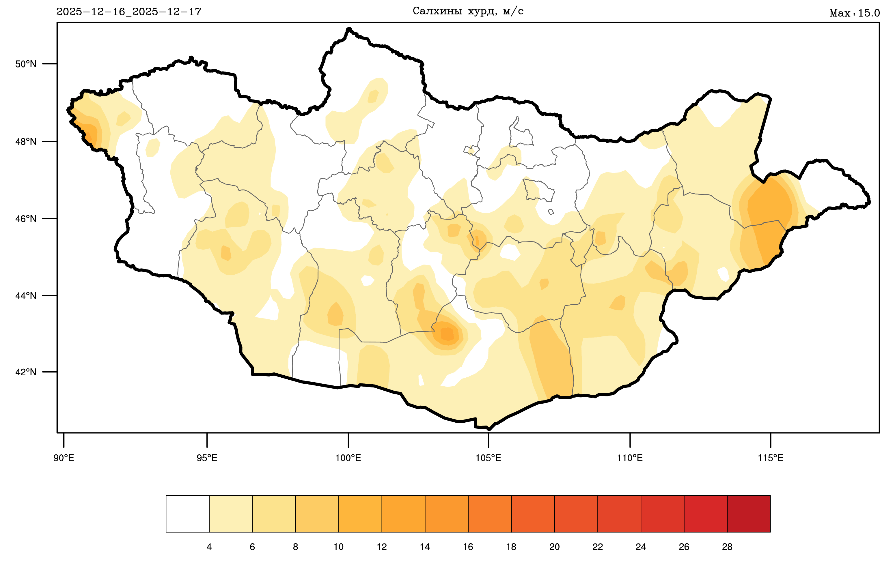 Салхи: Өнгөрсөн хоногт ихэнх нутгаар баруунаас секундэд 3-8 метр, говь, талын нутгаар зарим үед секундэд 13-15 метр хүрч ширүүссэн байна.